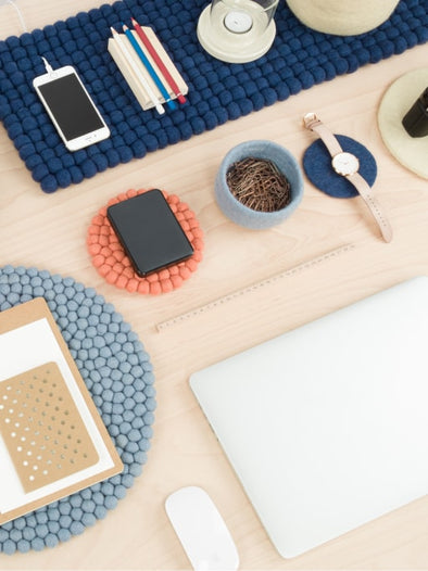 A beautiful and tidy workplace promotes concentration. Because work is often more effective and more pleasant in an orderly environment. The felt baskets and coasters from myfelt are used as small organisers. Their robust yet soft structure lends the study a special atmosphere. The felt baskets in different sizes and colours not only create order on the desk, but also cut a good figure on sideboards, shelves and side tables. Smartphones, headphones for the next video meeting, pens and other small work materials are kept handy and stylish in the study with the beautiful coasters.