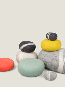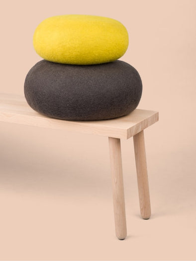 The solid-colored myfelt poufs and the realistic-looking felt pebbles are not only ideal as high-quality decorative elements in the living space. They are also popular as comfortable and natural seat cushions or as soft stools for autogenic training, yoga, and meditation, and are available in various sizes.