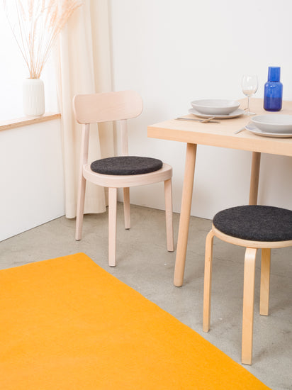For the handmade, charcoal-coloured mottled seat pad Hugo (36 cm, round), pure virgin wool is felted into a flat cushion. The pad not only creates a pleasant and comfortable sitting experience, but its simple design also provides a particularly classic, timeless touch for every favourite chair. myfelt seat pads are water- and dirt-repellent and can be used on both sides.