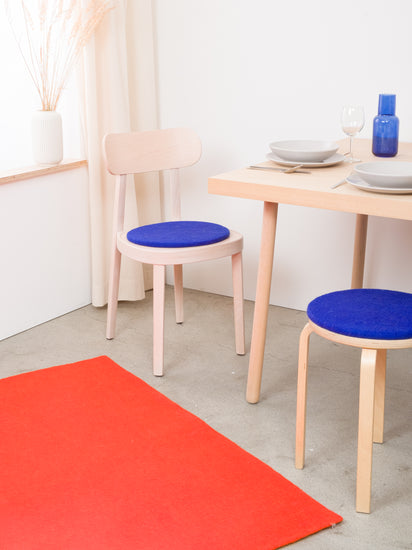 The round, flat Isa seat pad adds a cool and calming touch with its strong blue. Not only is it visually appealing, but thanks to the pure virgin wool it is also practical and robust, ideal for everyday use.