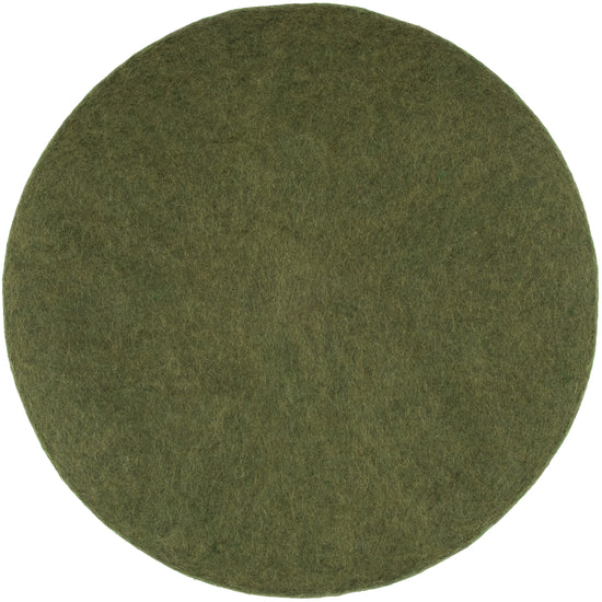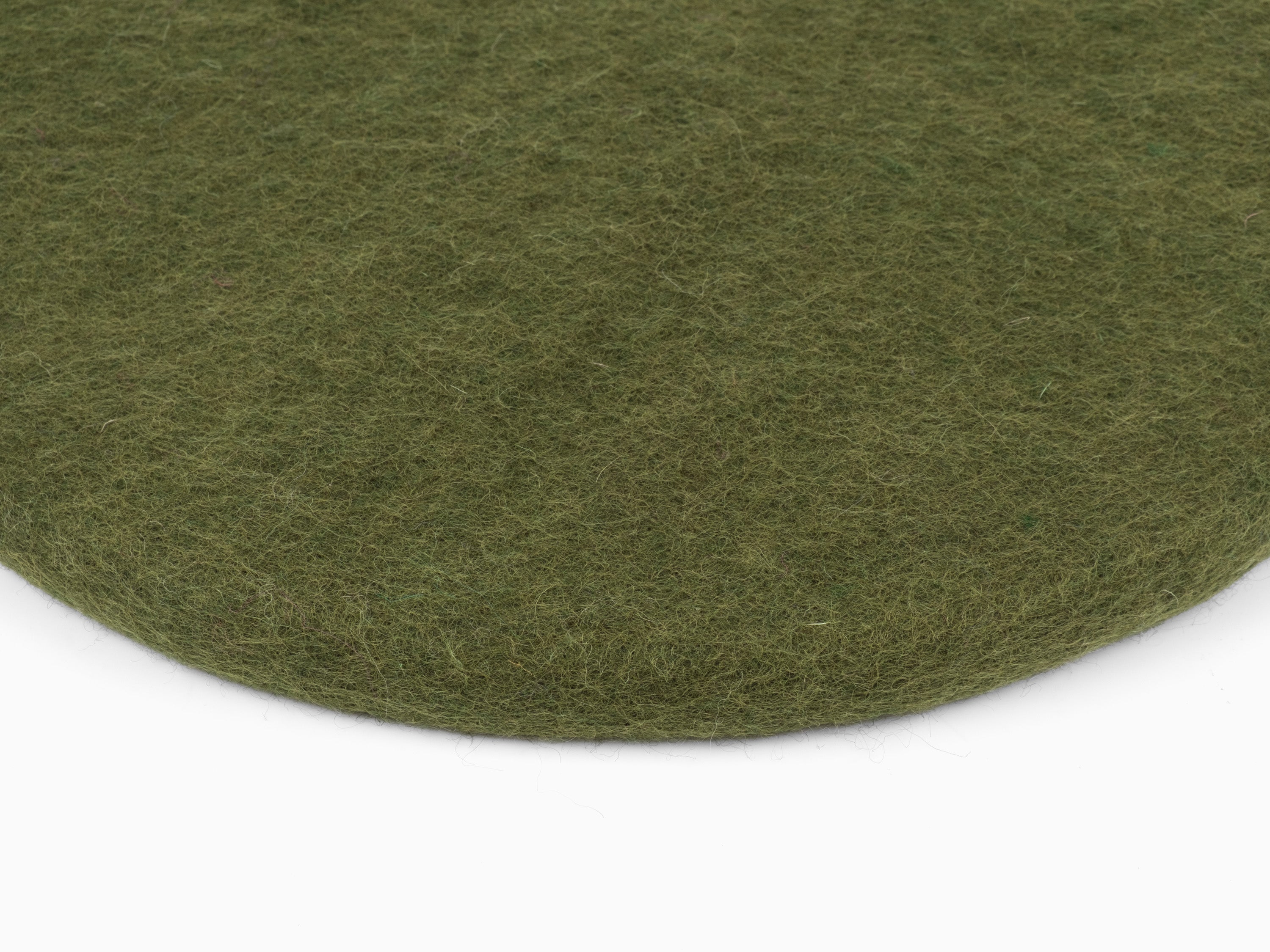 Round, dark green flat seat pad made of pure new wool.