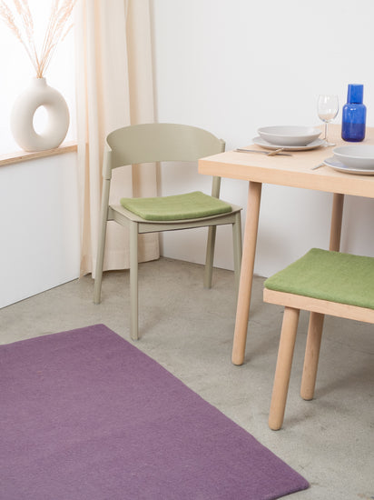 For the handmade, dark green seat pad Kaspar (36 x 36, square), pure virgin wool is felted to a flat cushion. Not only does it create a pleasant and comfortable sitting experience, but its fresh and lively design also adds a natural touch to your favourite chair. myfelt seat cushions are water- and dirt-repellent and can be used on both sides.