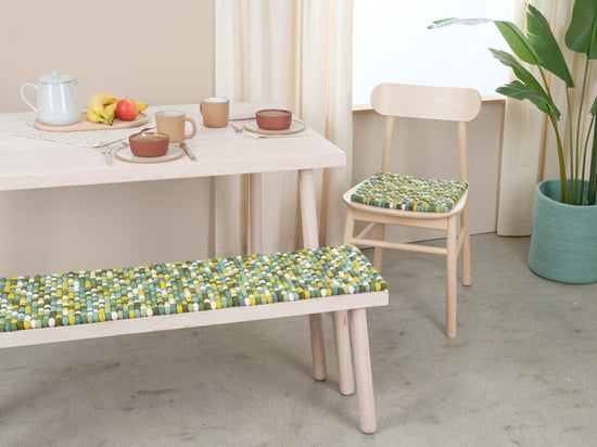 The multicoloured bench pad Finn adds warmth and softness to your favourite chair. Made from pure virgin wool