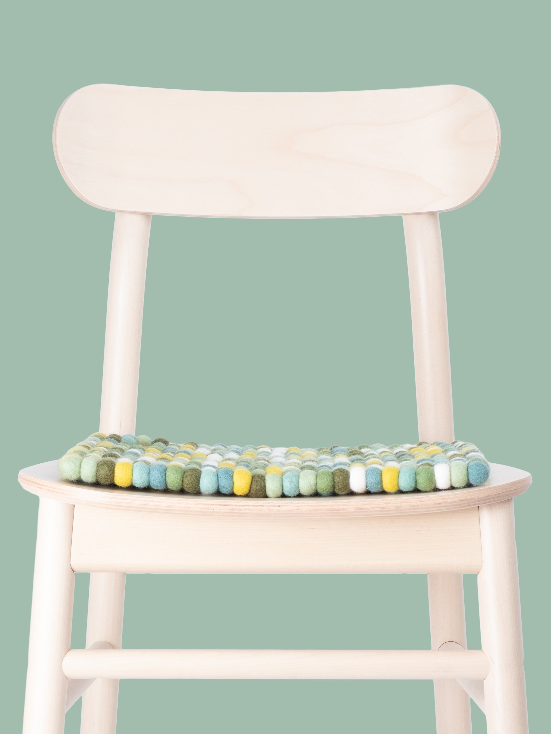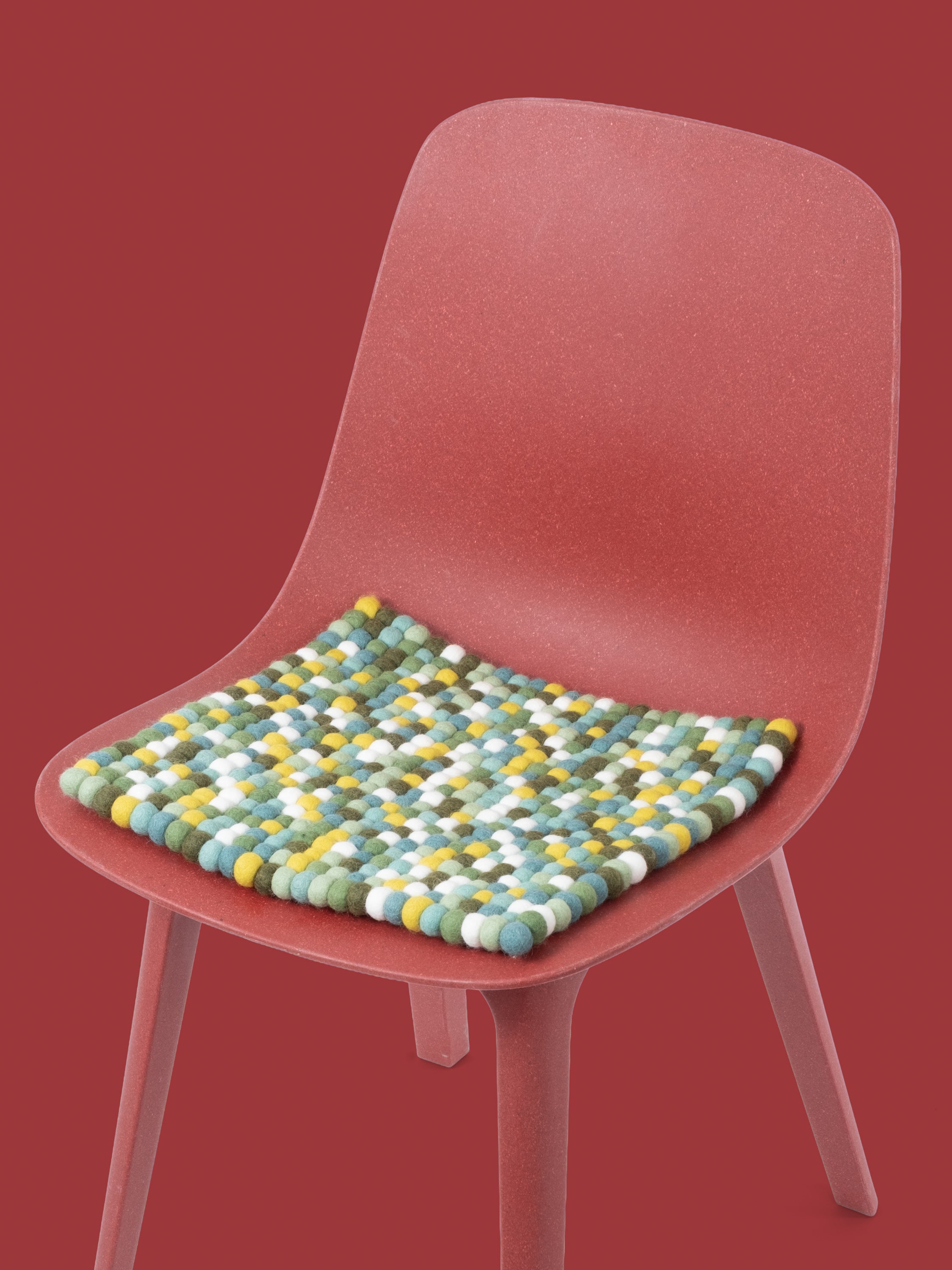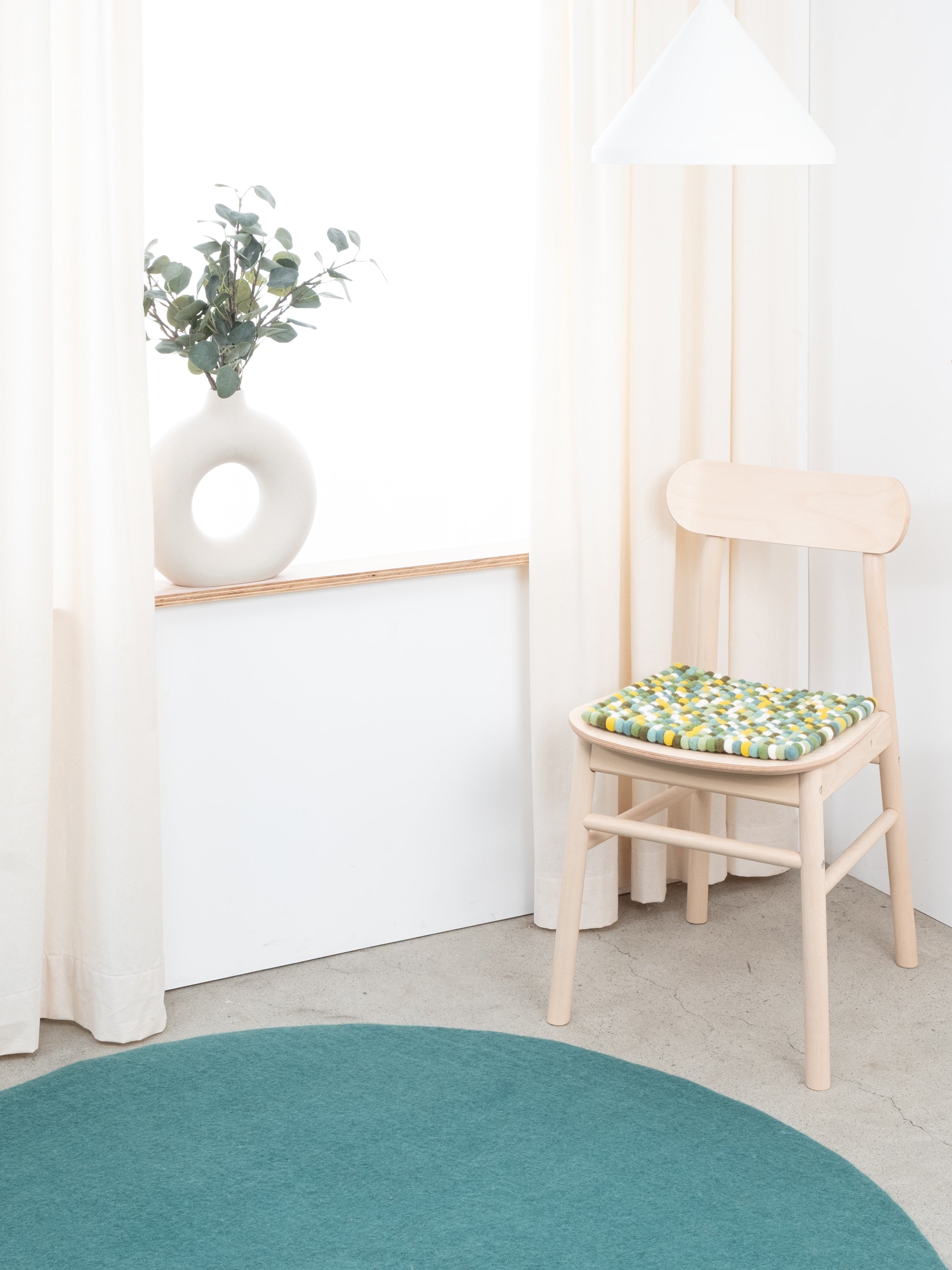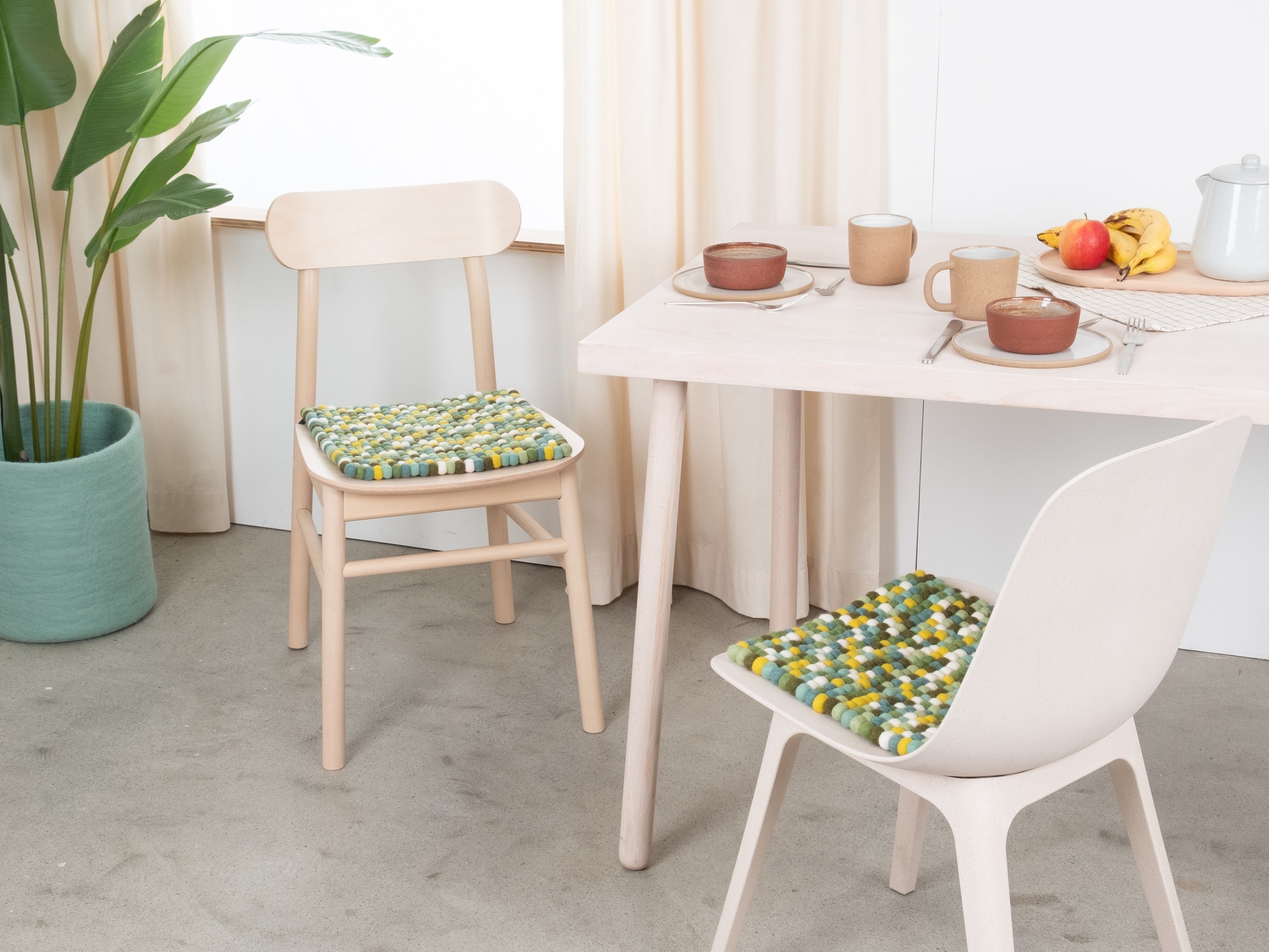 The multicolored seat pad Finn brings warmth and softness to your favorite chair. Made from pure new wool, handcrafted in Nepal and produced under fair conditions. myfelt seat pads are water- and dirt-repellent and can be used on both sides.