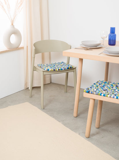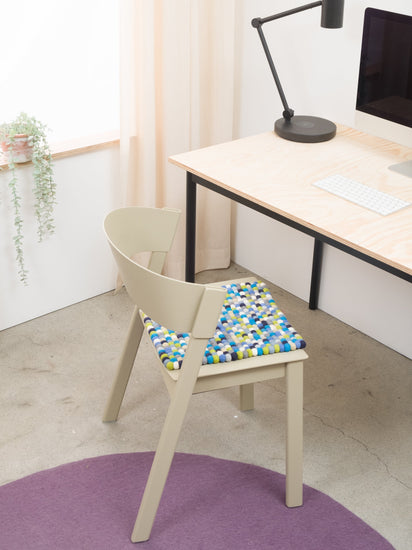 The square seat pad Fritz (36 x 36 cm), made pure, untreated virgin wool, not only creates a pleasant and comfortable sitting experience, but brings an amusing atmosphere to the chair at the same time, with its bold and brash design. Myfelt seat pads are dirt and water repellent.