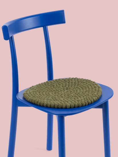 Round, dark green seat pad made of pure new wool.