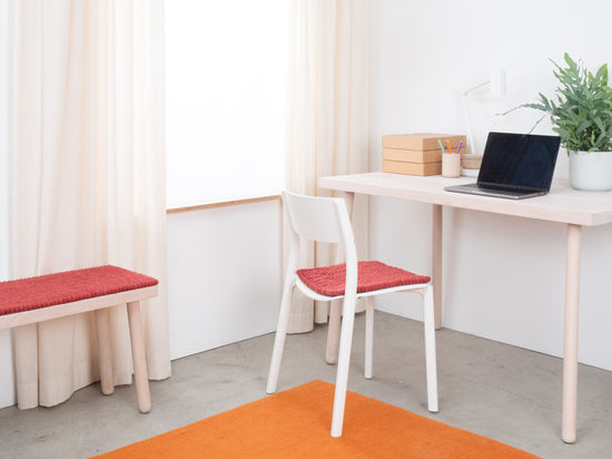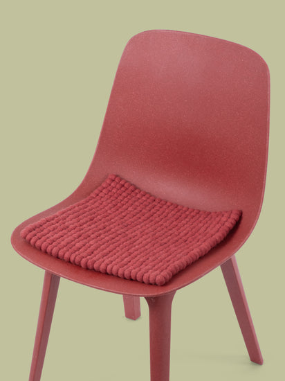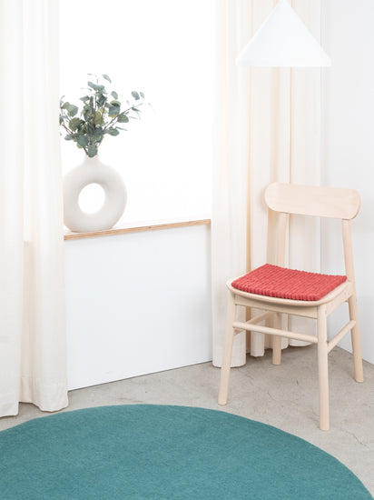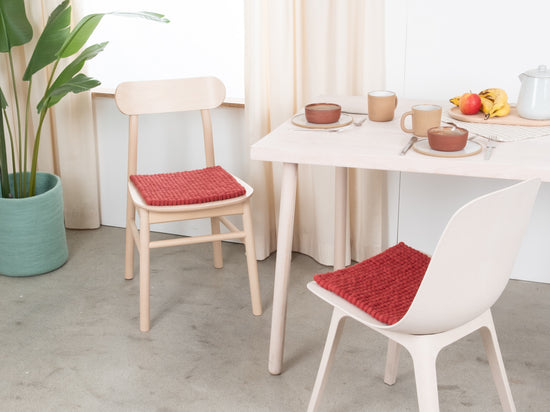 The wine red seat pad Kaja brings warmth and softness to your favorite chair. Made from pure new wool, handcrafted in Nepal and produced under fair conditions. myfelt seat pads are water- and dirt-repellent and can be used on both sides.