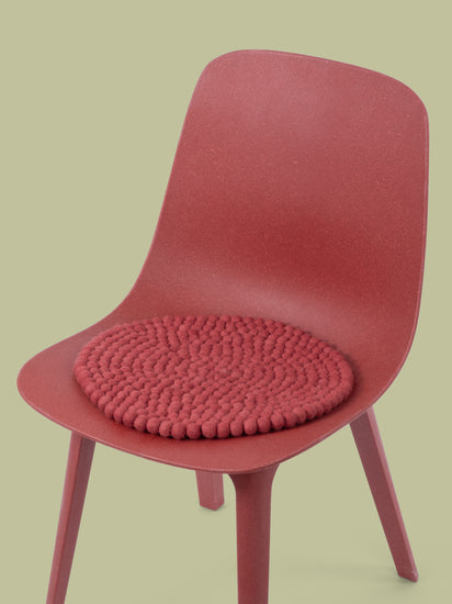 The wine red seat pad Kaja brings warmth and softness to your favorite chair. Made from pure new wool, handcrafted in Nepal and produced under fair conditions. myfelt seat pads are water- and dirt-repellent and can be used on both sides.