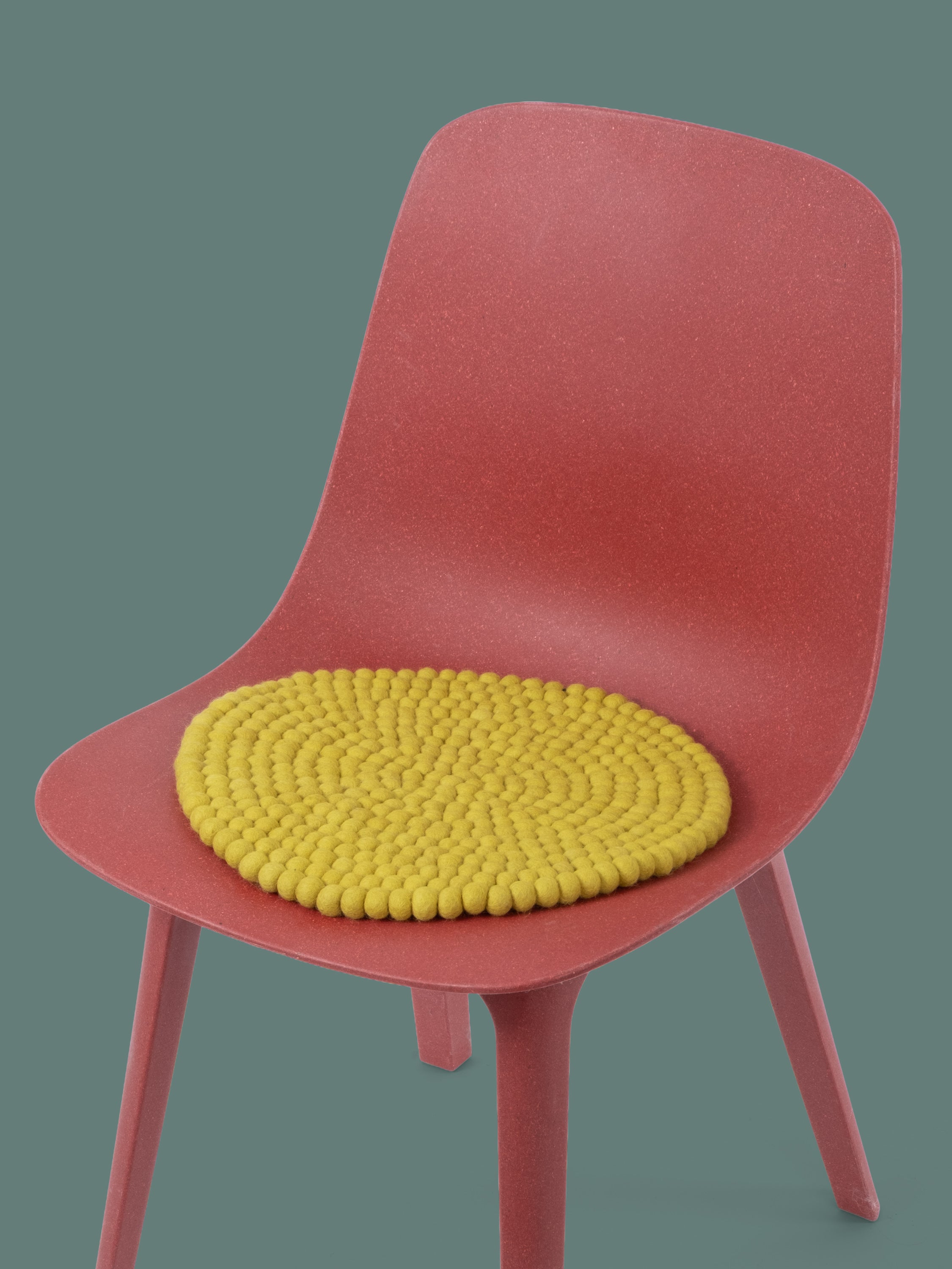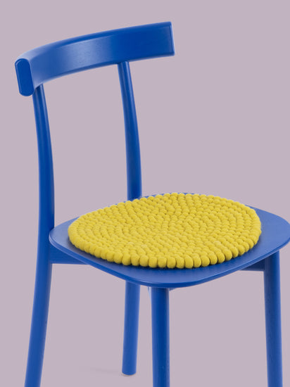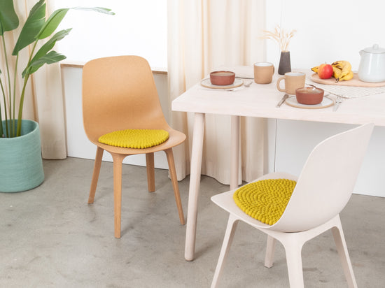 The green-yellow seat pad Kata brings warmth and softness to your favorite chair. Made from pure new wool, handcrafted in Nepal and produced under fair conditions. myfelt seat pads are water- and dirt-repellent and can be used on both sides.