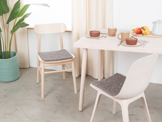 The gray seat pad Kian brings warmth and softness to your favorite chair. Made from pure new wool, handcrafted in Nepal and produced under fair conditions. myfelt seat pads are water- and dirt-repellent and can be used on both sides.
