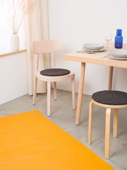 For the charcoal-coloured seat pad Kuno (36 cm, round), individual felt balls made of pure virgin wool are sewn together by hand. The pad not only creates a pleasant and comfortable sitting experience, but its timeless design also ensures a stylish look for your favourite chair. myfelt seat pads are highly water- and dirt-repellent and can be used on both sides.