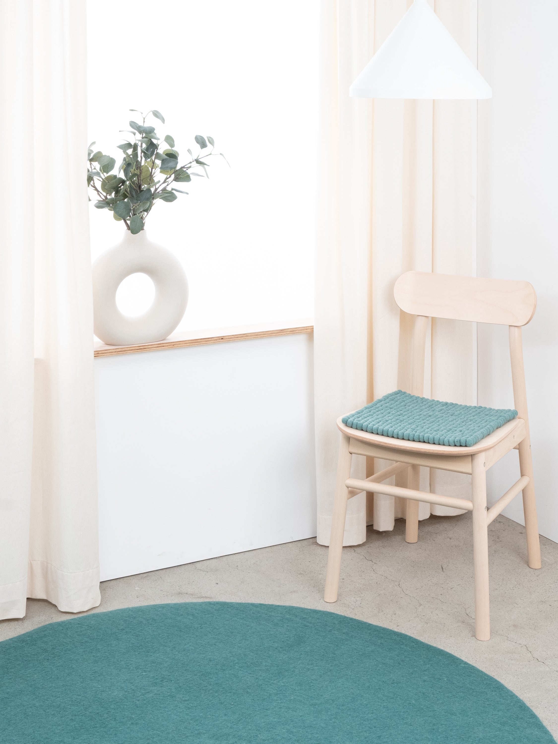 The aqua-colored seat pad Taro brings warmth and softness to your favorite chair. Made from pure new wool, handcrafted in Nepal and produced under fair conditions. myfelt seat pads are water- and dirt-repellent and can be used on both sides.
