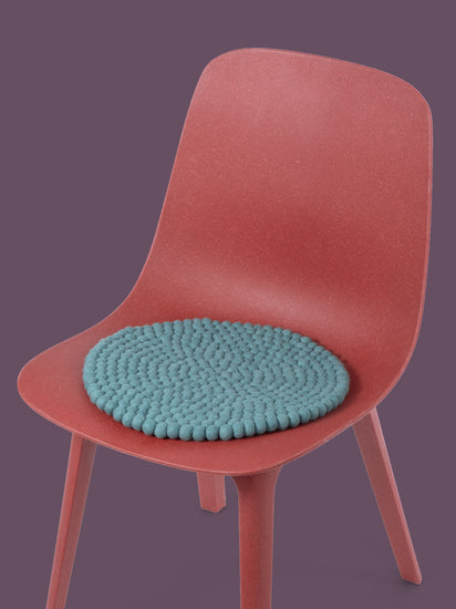 Round, aqua-colored seat pad made of pure new wool.