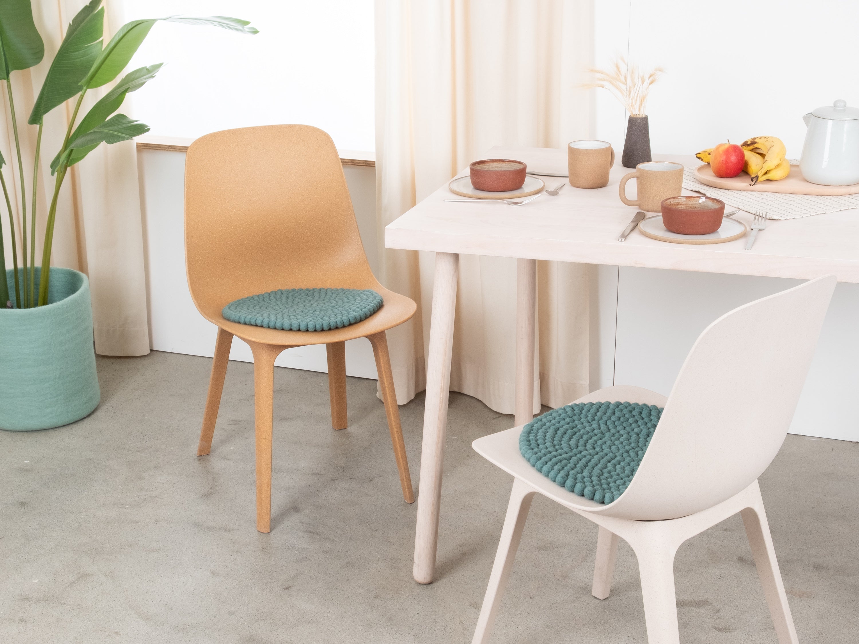 The aqua-colored seat pad Taro brings warmth and softness to your favorite chair. Made from pure new wool, handcrafted in Nepal and produced under fair conditions. myfelt seat pads are water- and dirt-repellent and can be used on both sides.