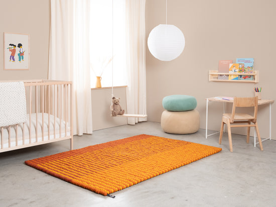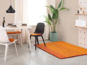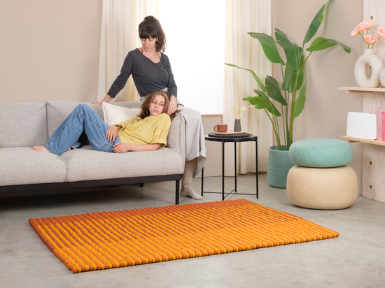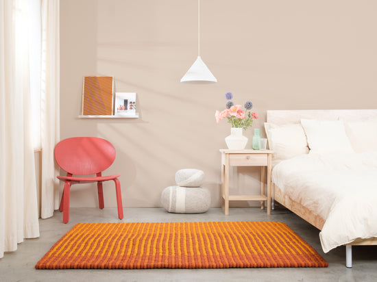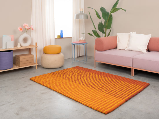 Golden orange. Amber. A hint of glow. Dawn is the first ray of light on warm ground. A rug that makes rooms shine. For everyone with their feet on the ground but their head turned toward the sun.