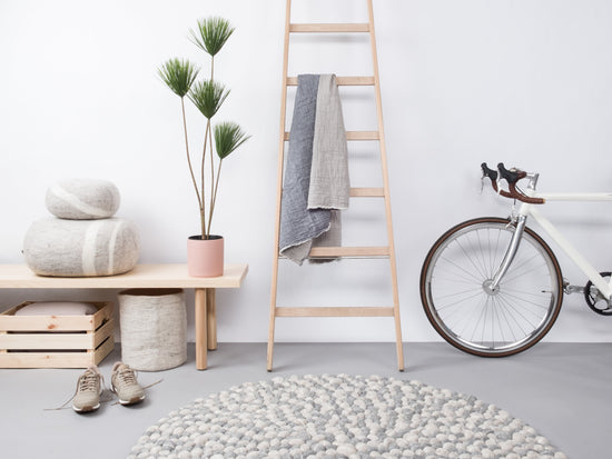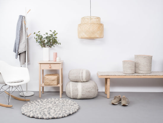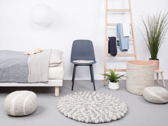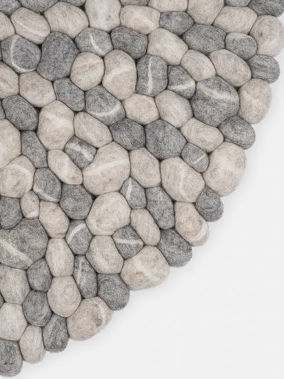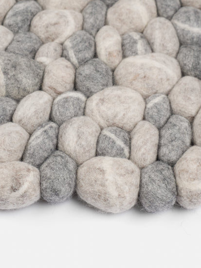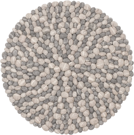 Round, grey Felt Ball Rug made from Virgin Wool.