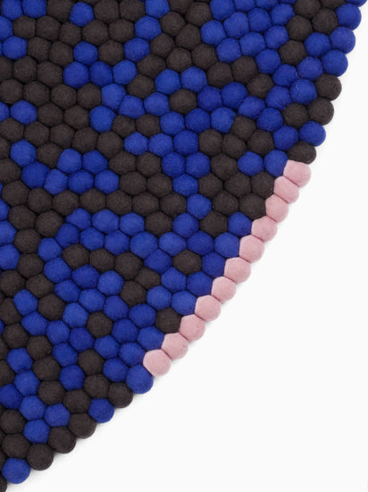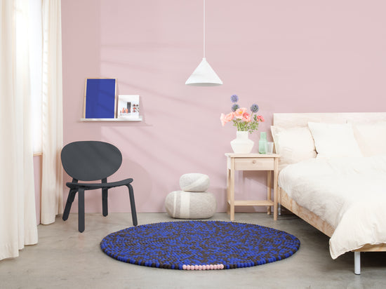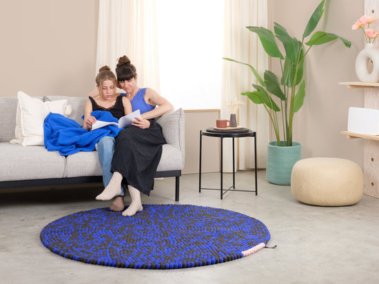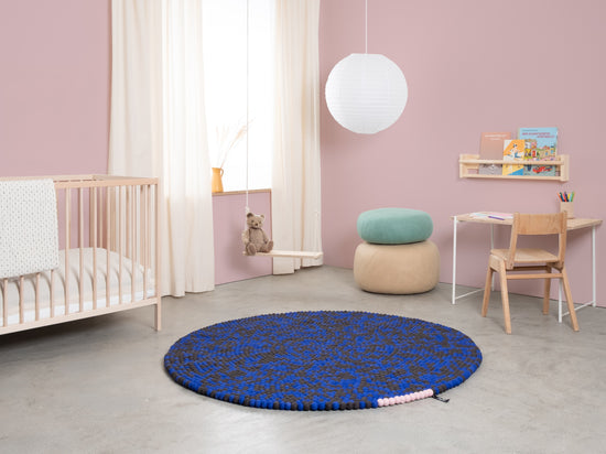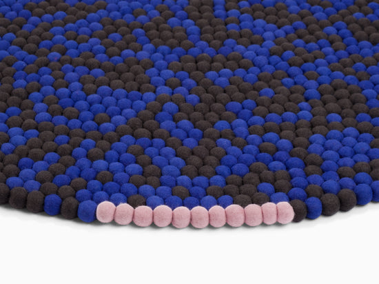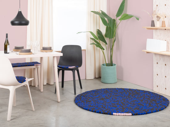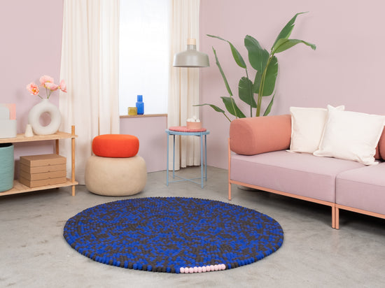 Cobalt blue and graphite: deep, focused, calm. A felt ball rug that grounds the room and makes colors shine. Easy-care, temperature-balancing, and long-lasting – Nepalese craftsmanship in precise structure.