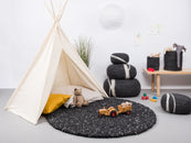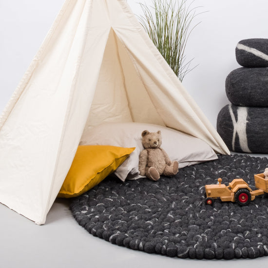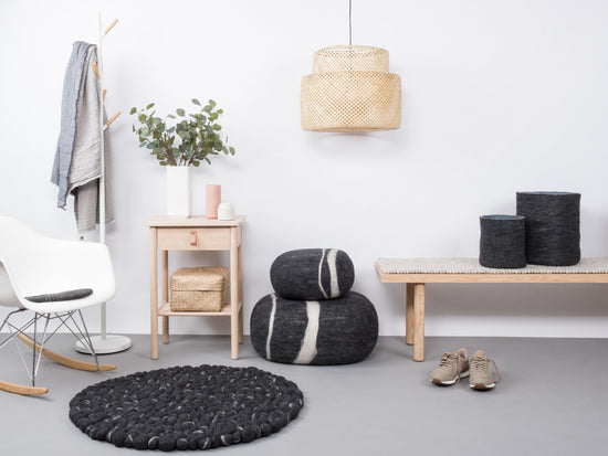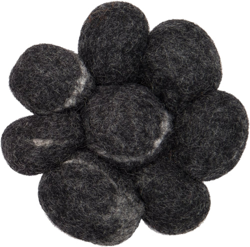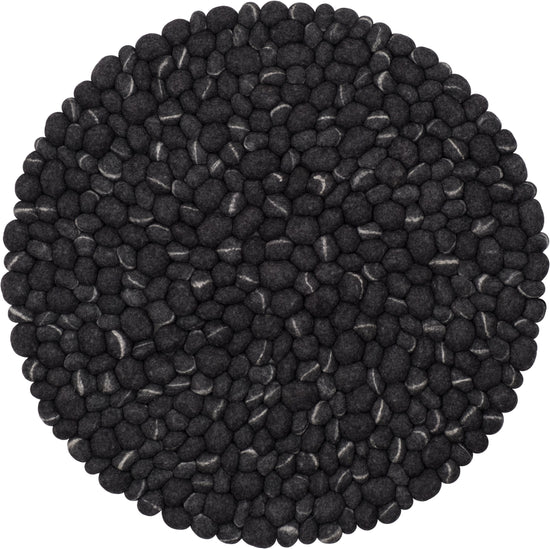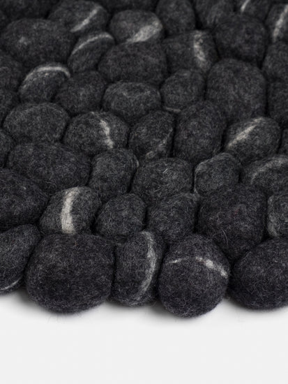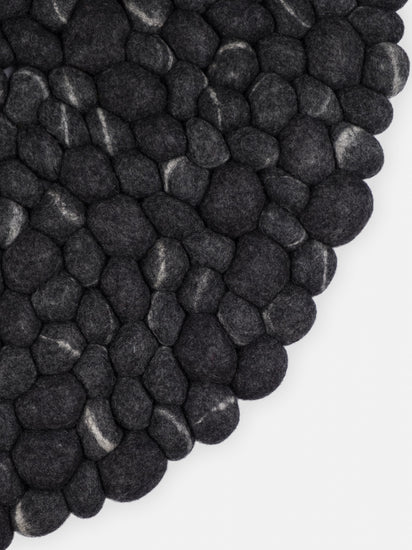 Round, anthacite Felt Ball Rug made from Virgin Wool.