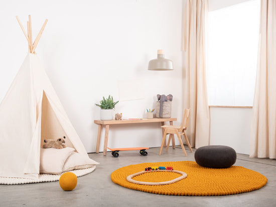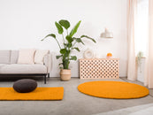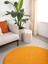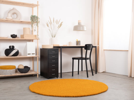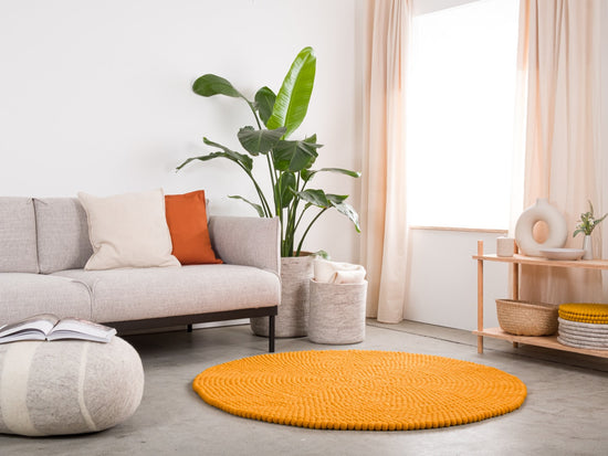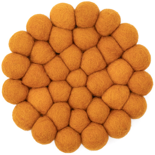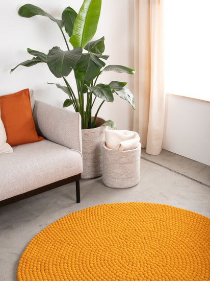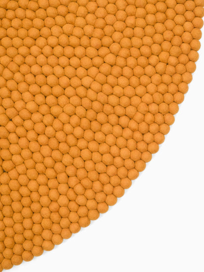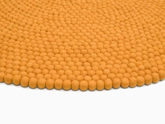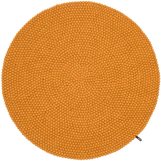 Round, ochre yellow Felt Ball Rug made from Virgin Wool.