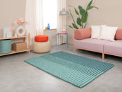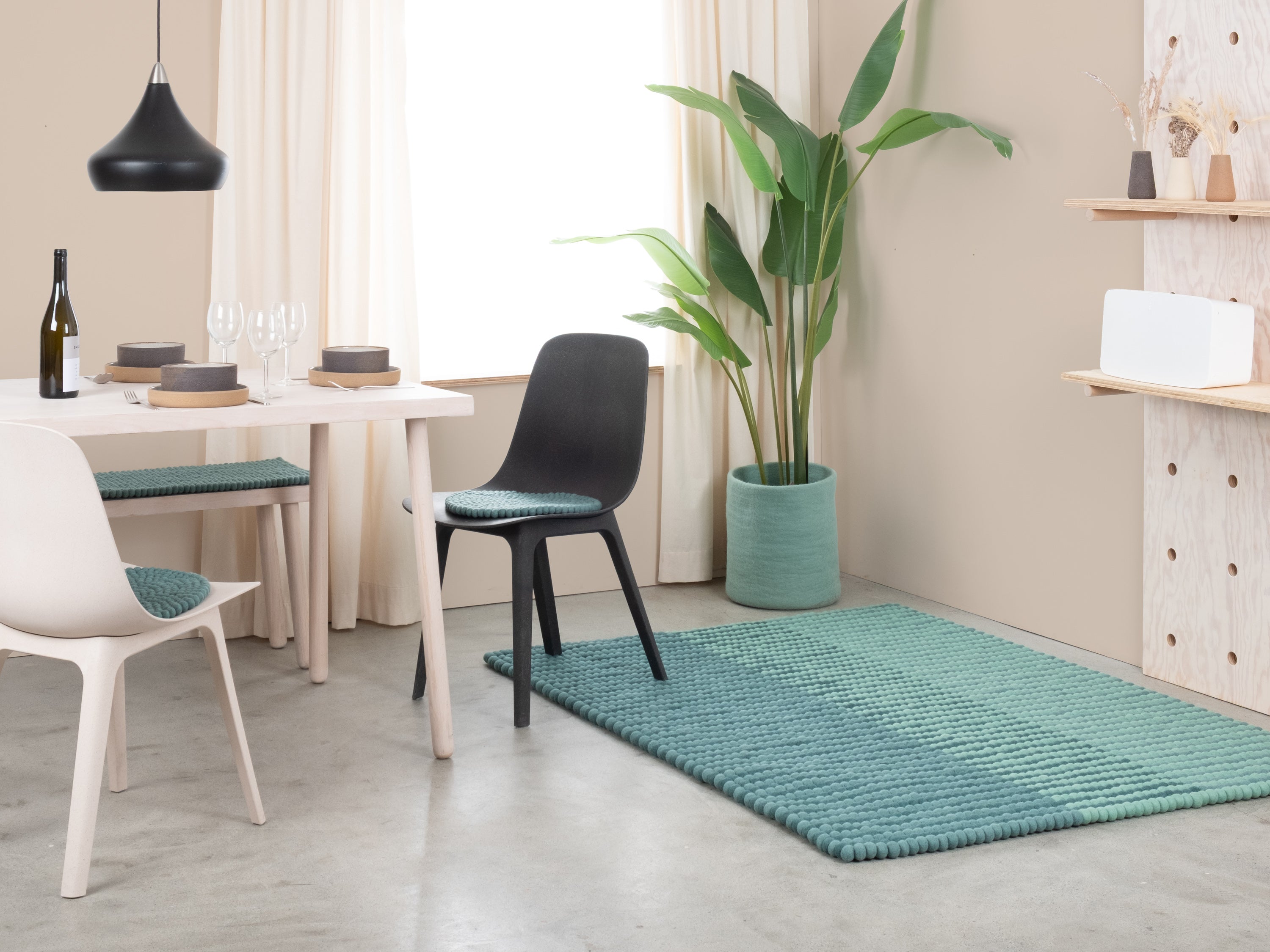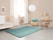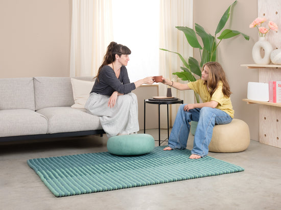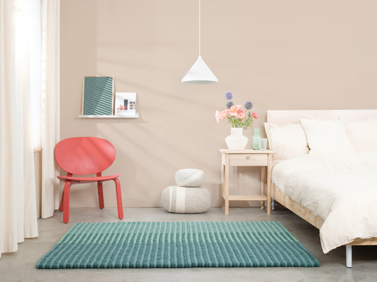 A deep tone in sage green. And in between: a hint of light. Sage brings calm to the room. And clarity to the feeling. A rug like a silent walk in the woods.