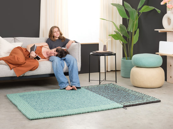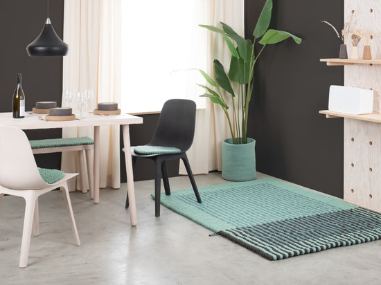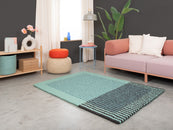 Cool shades of blue meet stony grey, with a hint of fir green. Yukon evokes quiet landscapes, glacier lakes, and the deep blue of the North. A rug that radiates clarity – and brings calm. For anyone who wants to clear their mind.