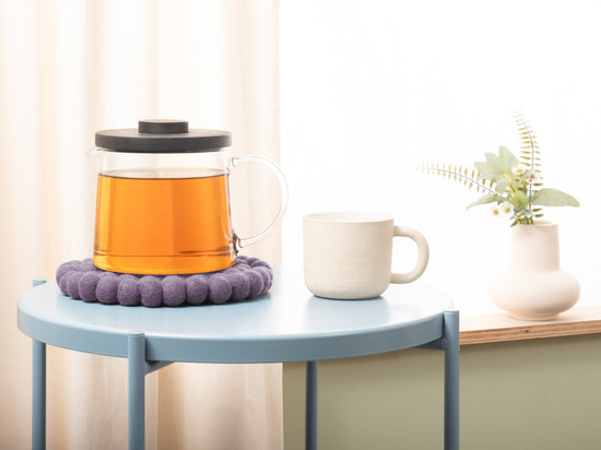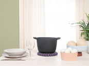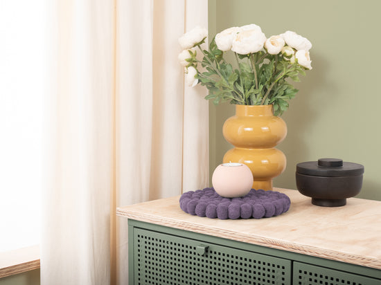 The trivet Frida in the colour violet combines functionality with charming design. Robust, heat-resistant, water- and dirt-repellent, and reversible. Made from pure new wool, handcrafted in Nepal under fair conditions.