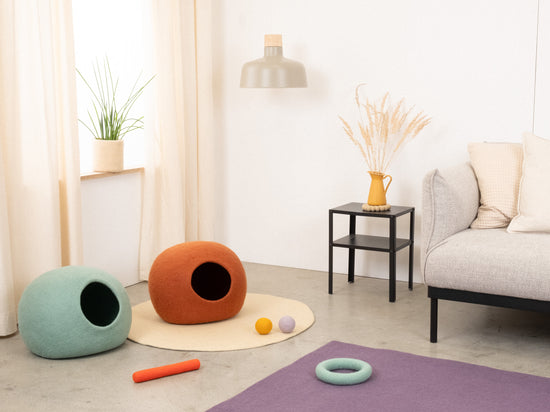 Both large and small cats will feel comfortable and secure in the handmade pure new wool cat cave. Sustainable and durable, pure wool contains lanolin, which makes it easy to care for, antibacterial and temperature regulating. This keeps the cat cave warm and cosy in winter and pleasantly cool in summer.