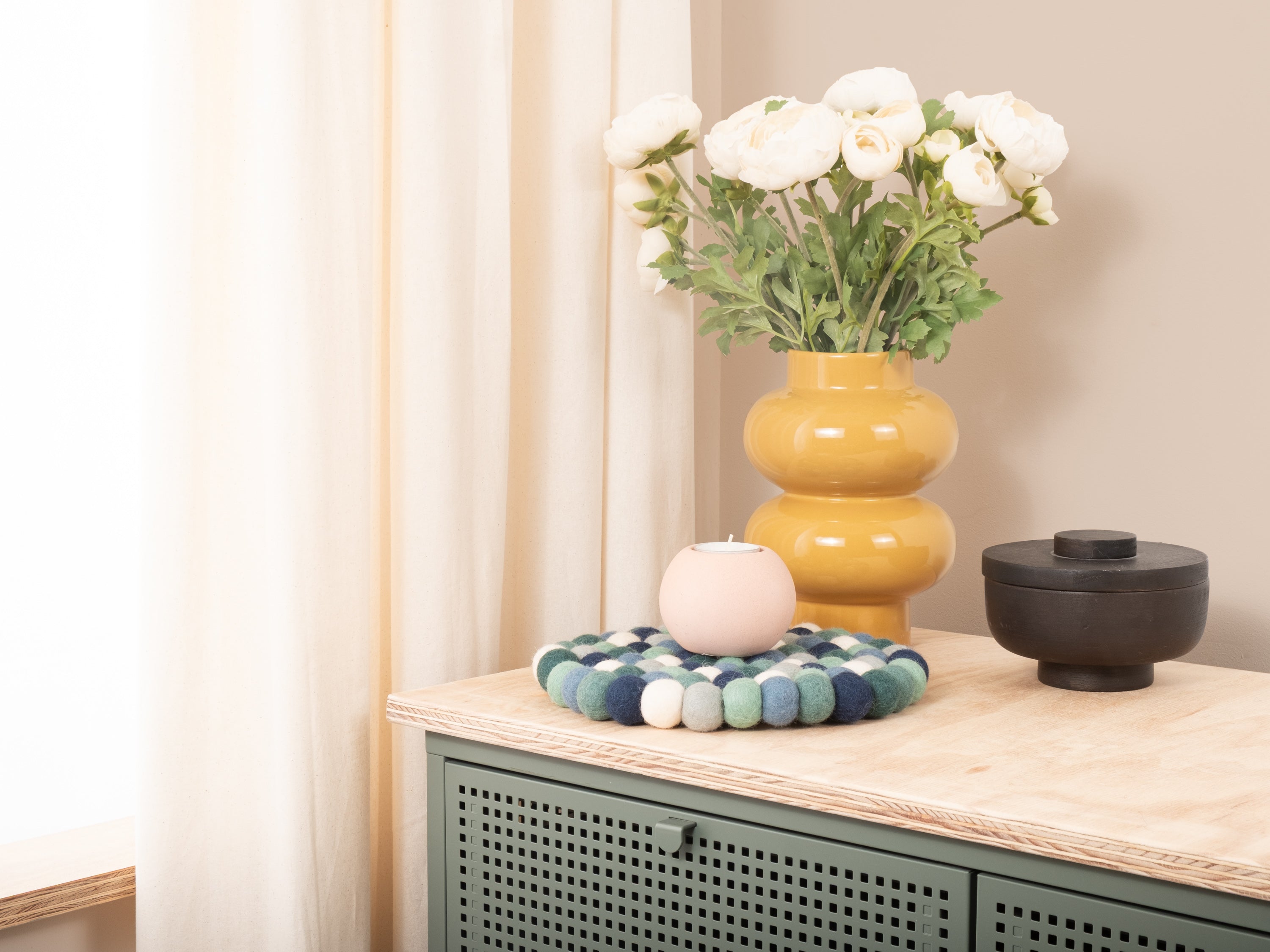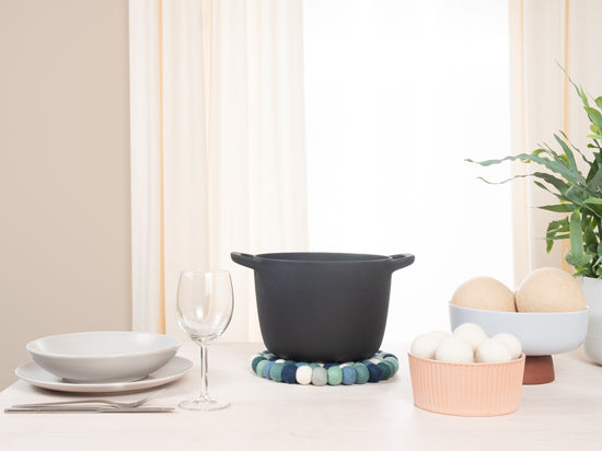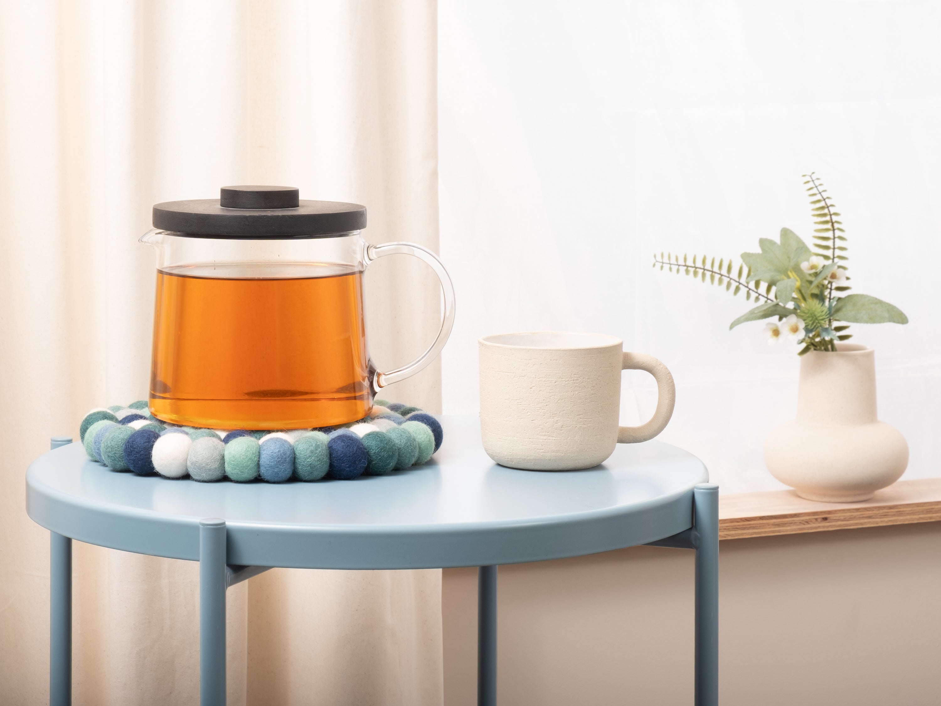 The trivet Mare in the colour multicolour combines functionality with charming design. Robust, heat-resistant, water- and dirt-repellent, and reversible. Made from pure new wool, handcrafted in Nepal under fair conditions.